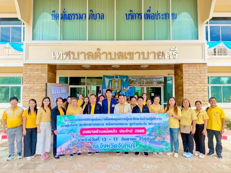 (15 กันยายน 2568) นายบัญชา โพธิหัง นายกเทศมนตรีตำบลเขาบายศรี พร้อมคณะผู้บริหารฯ สมาชิกสภาเทศบาลฯ หัวหน้าส่วนราชการ พนักงานและเจ้าหน้าที่ ร่วมให้การต้อนรับคณะศึกษาดูงาน จากเทศบาลตำบลบ่อแฮ้ว อำเภอเมือง จังหวัดลำปาง โดยเข้าศึกษาดูงานด้านการบริหารจัดการที่ดีตามหลักธรรมาภิบาล ณ สำนักงานเทศบาลตำบลเขาบายศรี อำเภอท่าใหม่ จังหวัดจันทบุรี